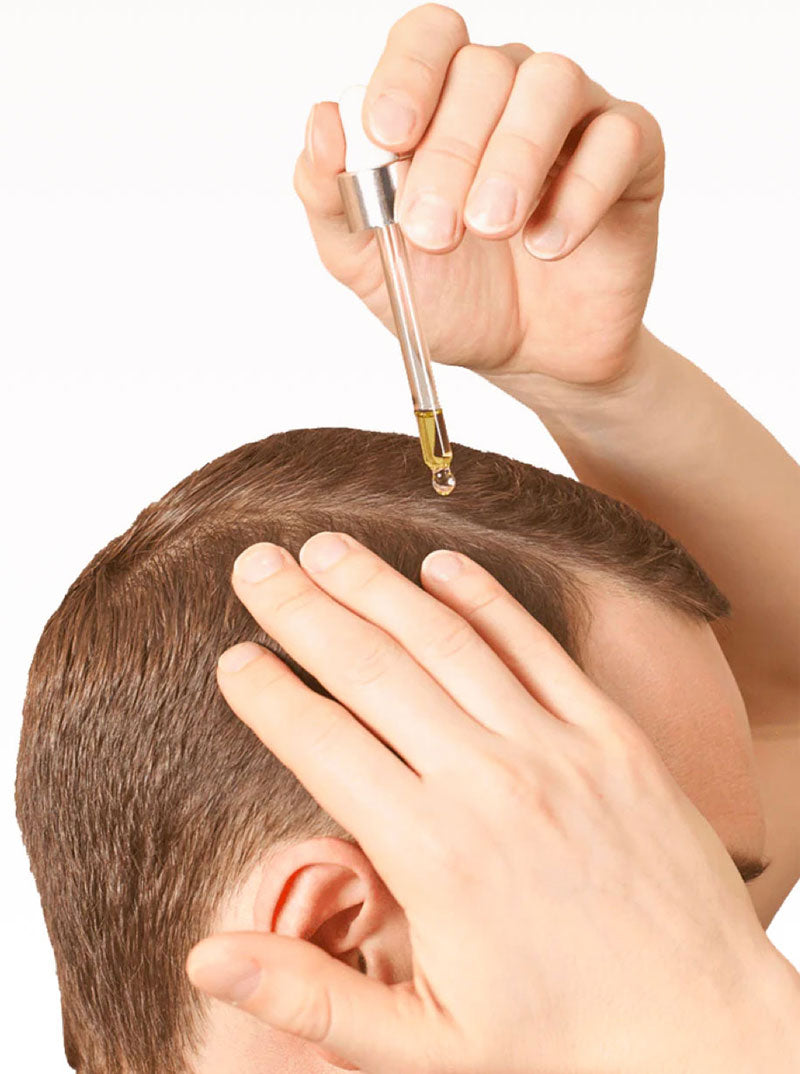 Ein paar Tropfen auf die Kopfhaut auftragen. Nicht ausspülen.